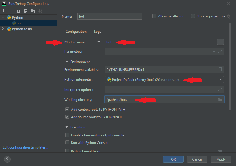 poetry run task start, or directlypython -m bot. - If using PyCharm, enter